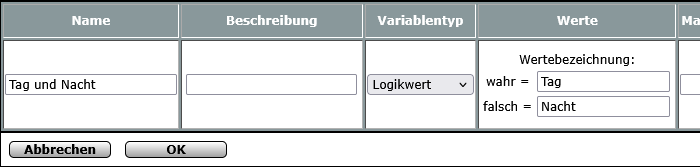 Nachdem wir nun einen Helligkeitswert haben, der dem Tagesgeschehen träge hinterherläuft, ist es Zeit für die Systemvariable, die Tag und Nacht speichert.