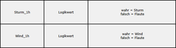 Die Variablen Sturm_1h und Wind_1h sind Logikwerte, die Sturm bzw. Wind oder Flaute signalisieren können. Sie werden unabhängig voneinander gesetzt, denn auch wenn ein Sturm vorbei ist, kann es immer noch windig sein.