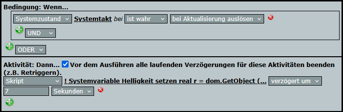 Theoretisch könnte ich auch den Kombisemsor als Gerät auswählen und das Script bei Aktualisierung der Helligkeit ausführen lassen. Allerdings kommt es dann womöglich zu unvorhersehbaren Werten, wenn der Kombisensor nicht regelmäßig seine Daten liefert – Funkstörungen oder ähnliches. Deshalb gehe ich auf Nummer sicher und bleibe beim Systemtakt.