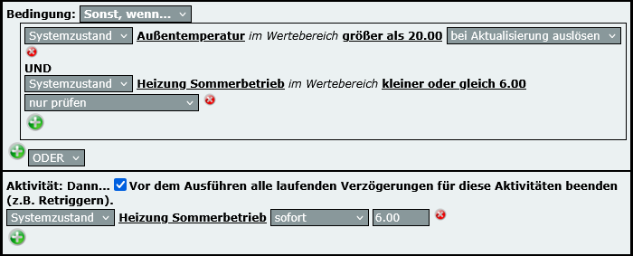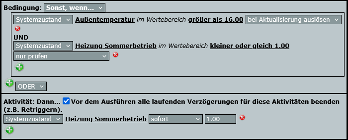 Der einfachste Anwendungsfall ist natürlich die Identifizierung des Sommerbetriebs: Wenn Heizung Sommerbetrieb größer als 0 ist, bleibt der Brenner aus.
