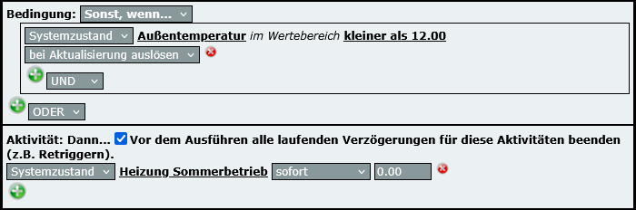 Diese zusätzliche Bedingung ist wichtig, damit bei tieferen Nachttemperaturen nicht der 30-Stunden-Countdown des vorherigen Programmteils überschrieben wird und die Heizung im Hochsommer am Morgen anspringt, bevor es wieder mehr als 16 Grad sind.