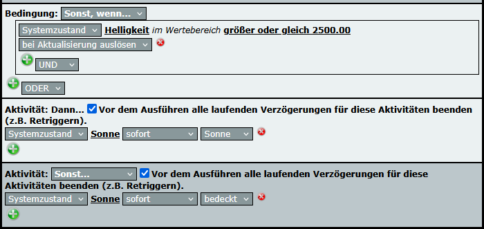 Wenn ich schon mal dabei bin, meine CCU mit Systemvariablen vollzupflastern, dann kann ich auch noch eine dritte anlegen, die mir Sonnenschein (für die Beschattung meiner Räumlichkeiten) und Regen (für die Beschirmung meines müden Hauptes) anzeigt.