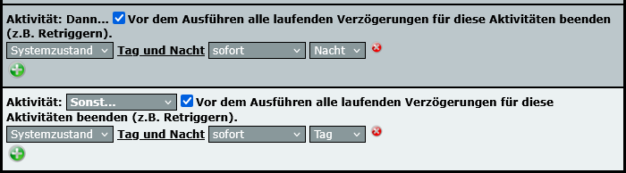 Als erstes kommt das Zeitmodul: Wenn es zwischen 22:00 abends und 06:00 morgens ist, dann ist bei mir Nacht. Basta. Das Zeitmodul wird täglch ausgeführt und setzt dem Tag eine harte Grenze.
