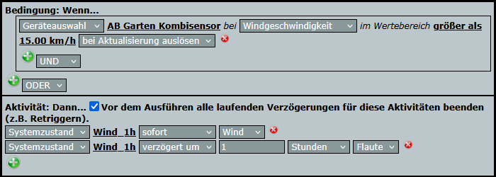 Die Lösung: Zwei Systemvariable, die bei Wind bzw. Sturm aktiviert werden und erst nach einer Stunde wieder in ihren Ausgangsstatus zurückfallen, wenn zwischendurch kein Wind mehr wehte.