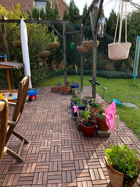 Schön zu sehen die Terrassenfliesen von IKEA. Nicht so schön zu sehen, wie das Unkraut trotz Folie durchdringt (Schachtelhalm …) und die Fliesen teilweise etwas locker liegen. Für die Fotos haben wir natürlich vorher die Terrasse gemäht.