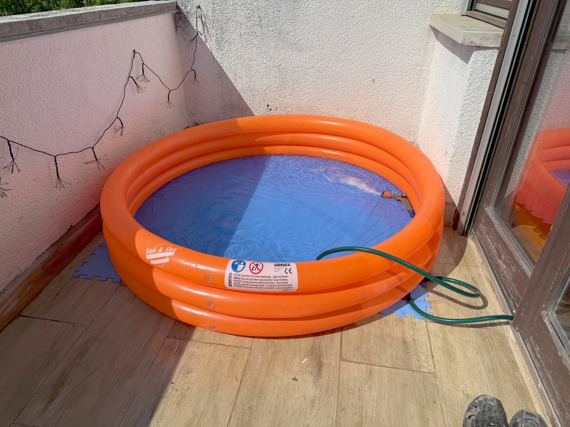 Die Fliesen waren relativ frisch verlegt und wurden anschließend noch versiegelt, weil es in die Wohnung darunter tropfte – bei Regen, nicht wegen unseres Pools! Allerdings hat das Harz besser an unserem Pool und der Unterlage geklebt als an den Fliesen, so dass dann am Ende des Sommers die Hälfte der Versiegelung wieder weg war.