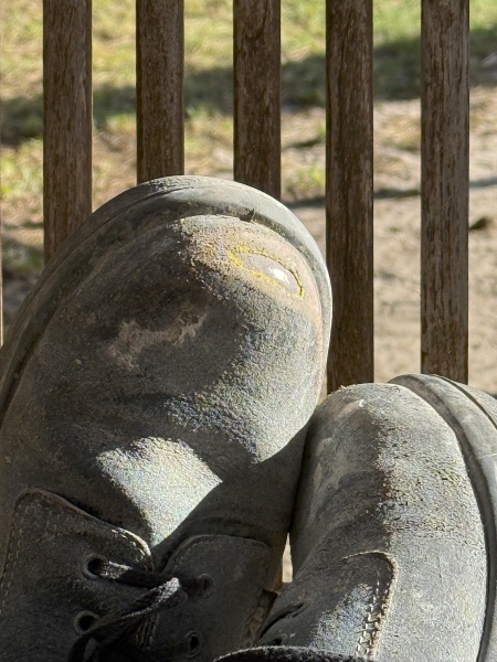 Meine Arbeitsschuhe überleben Trockenbau keine zwei Wochen. Aber immerhin glänzen sie schön in der Sonne, auch wenn sie noch nie geputzt wurden – auf dem Bild leider nur zu erahnen.