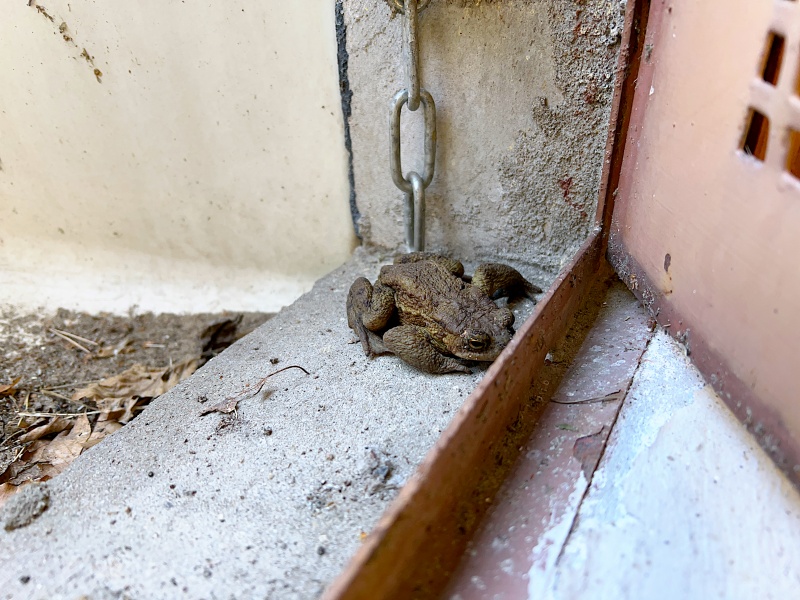 Also Fenster zu, rauf, raus aus dem Haus, Schaufel und Eimer aus der Sandkiste gesucht, wieder runter, Fenster auf … Frosch war weg.