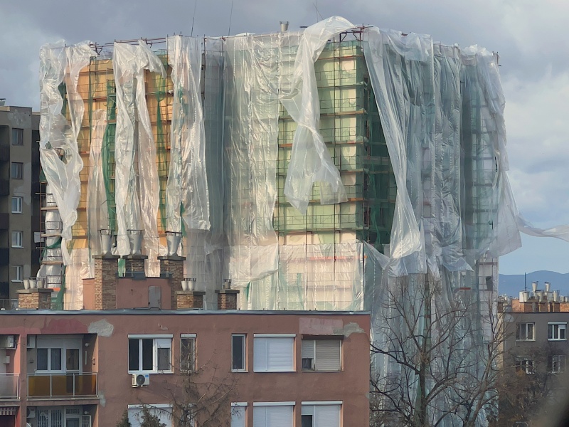 Der Wohnblock in der Nachbarschaft wurde professionell eingepackt, um die Fassade zu sanieren. So sah es dann aus, als Sturm aufkam.