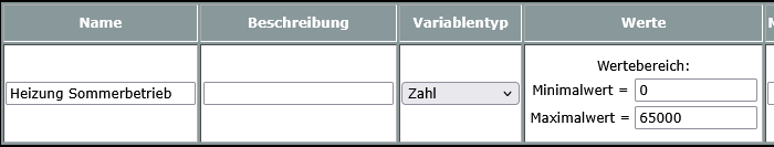 Das ist ein ganz einfaches Ding. Minimal- und Maximalwerte müssen gar nicht angepasst werden – die Variable Heizung Sommerbetrieb wird per Software zwischen 0 und 30 gesetzt. Dabei bedeutet ein Wert größer als 0, dass die Anlage sich im Sommerbetrieb befindet.