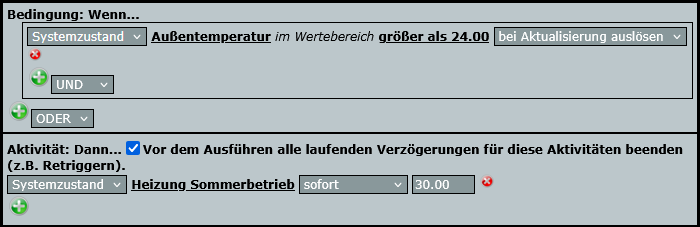 Diese zusätzliche Bedingung ist wichtig, damit bei tieferen Nachttemperaturen nicht der 30-Stunden-Countdown des vorherigen Programmteils überschrieben wird und die Heizung im Hochsommer am Morgen anspringt, bevor es wieder mehr als 16 Grad sind.